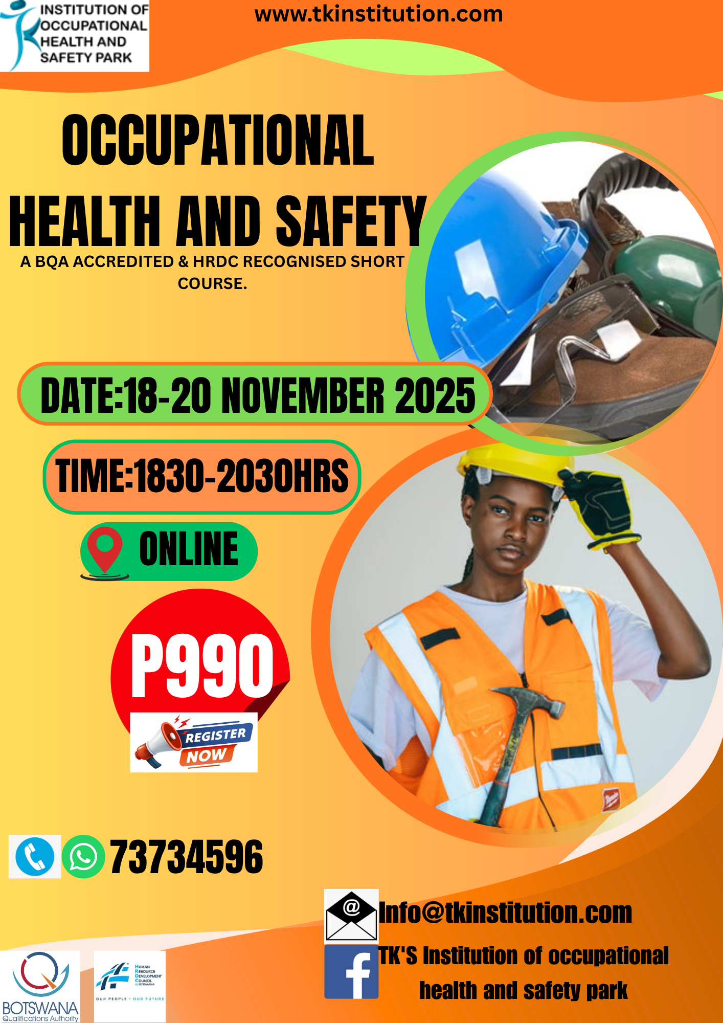 - Accredited Course: Our OHS training is fully accredited by the Botswana Qualifications Authority (BQA) is recognized by the Human Resource Development Council (HRDC) thus, ensuring the highest standards of quality and relevance.